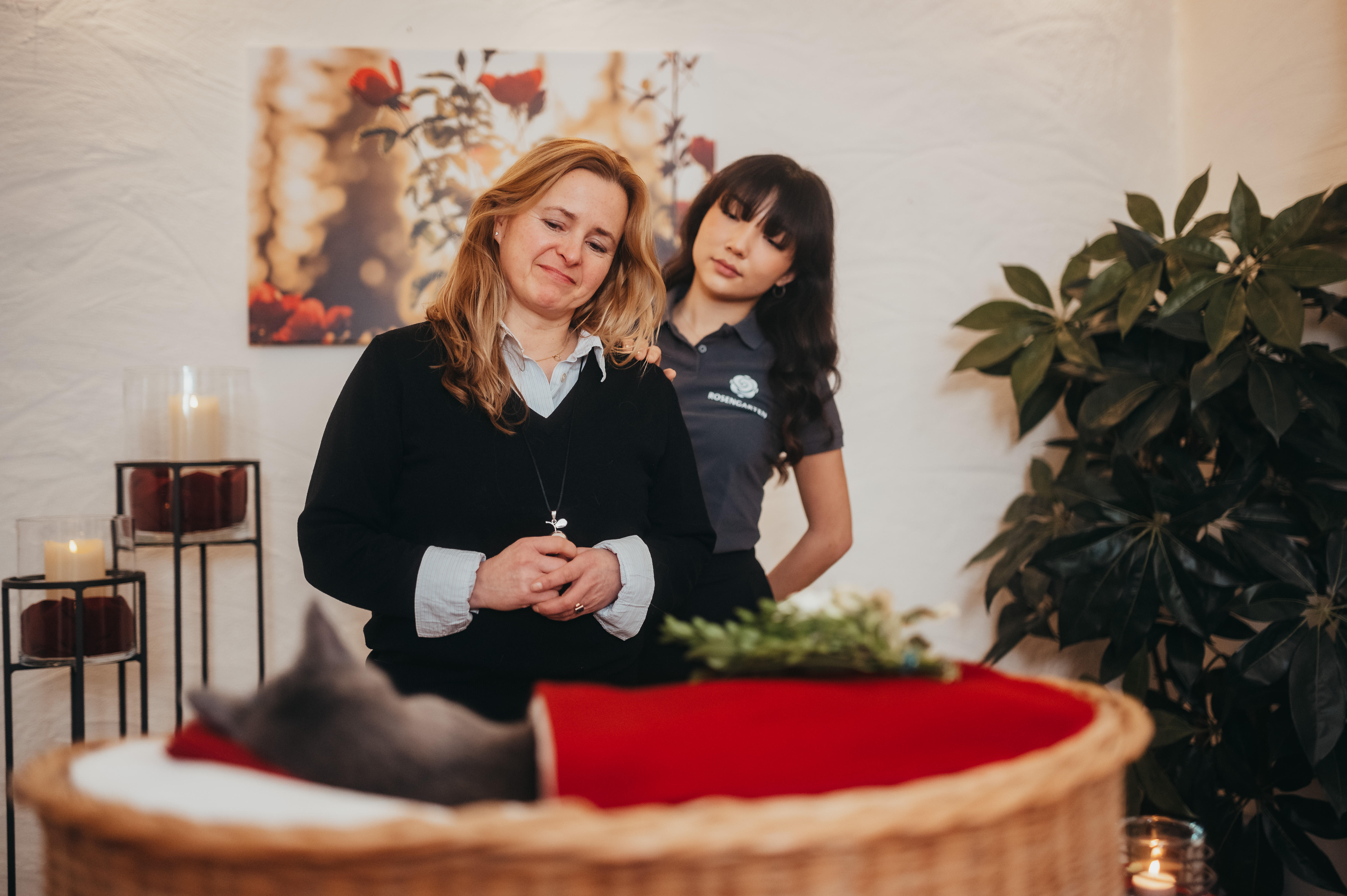 Während der schweren Phase des Abschieds stehen wir Ihnen mit unserer Erfahrung und unserem Mitgefühl bei. Bei einer ROSENGARTEN-Direktkremierung begleitet Sie das ROSENGARTEN-Team persönlich auf dem letzten Weg Ihres treuen Begleiters und spendet Trost in der Trauer. Bei der Direktkremierung wird Ihr geliebtes Haustier in einem Abschiedsraum, den wir Raum der Stille nennen, aufgebahrt. Hier haben Sie die Möglichkeit, sich persönlich zu verabschieden.